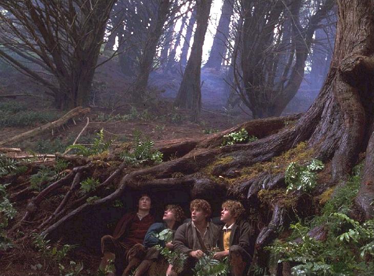 בסרט, כדוגמאת סצינת: "Get Off The Road!", כאשר ההוביטים נמצאים ביער בסרט הראשון. מי