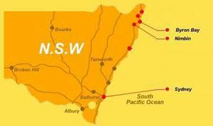 כ-11 שעות נסיעה באוטובוס, צפונית לסידני נמצאת עיירה קטנטנה בשם ביירון ביי (מפרץ ביירון).